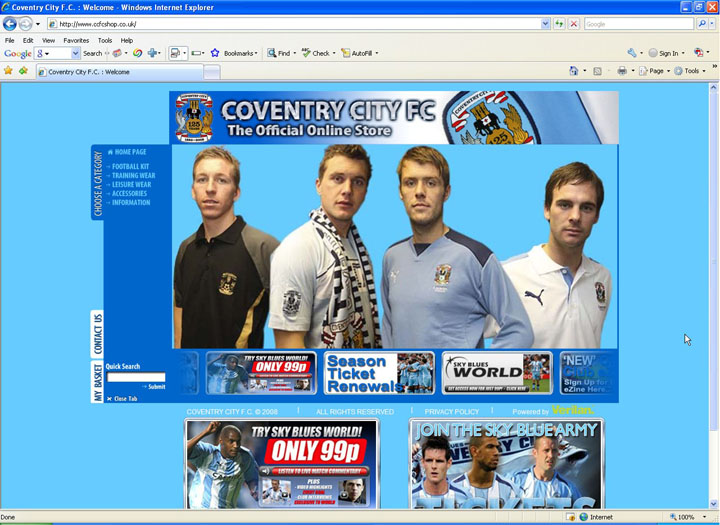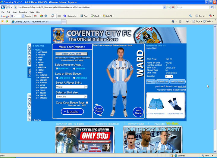 Info: The CCFC Shop designed to be a fully interactive user experience unlike any other online professional football club shop. The user is able to view the kit they wish to purchase being worn by members of the team and they can also view the customisatated own named shirts prior to purchase by applying them to an interactive model. Rotate the shirt and add extra details such as shirt cocoa-cola tags